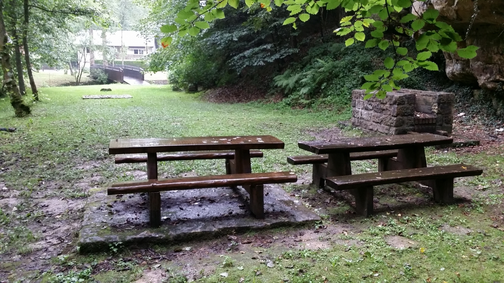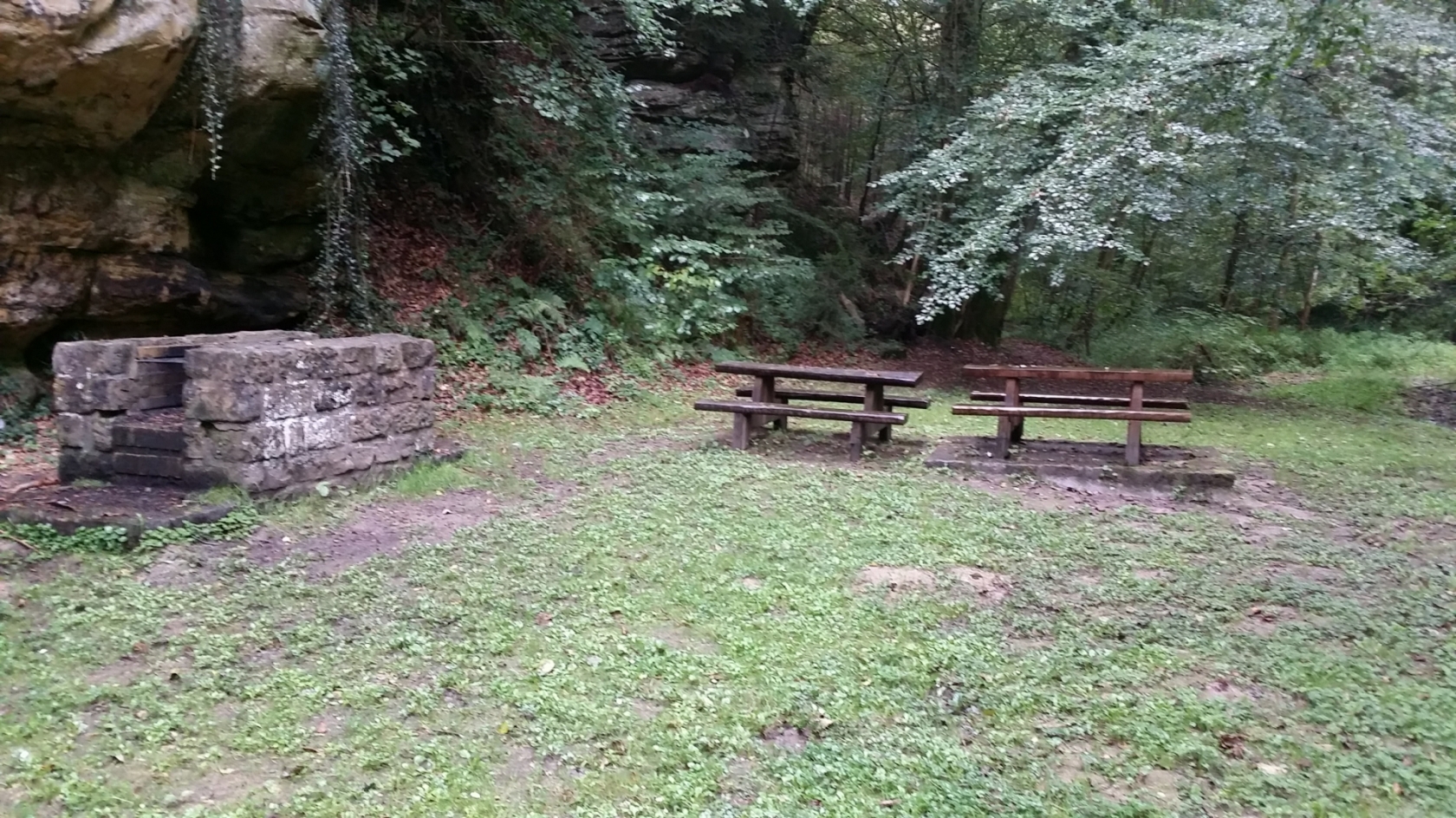 Waldnaher Grillplatz mit Sitzmöglichkeiten.
