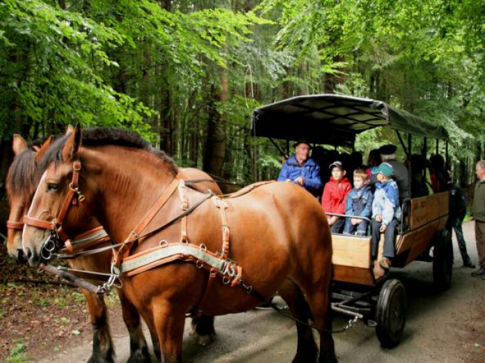 During the carriage tour the forester gives explanations to the forest management. Participants watch trees being felled and taken away by Ardennes horses.